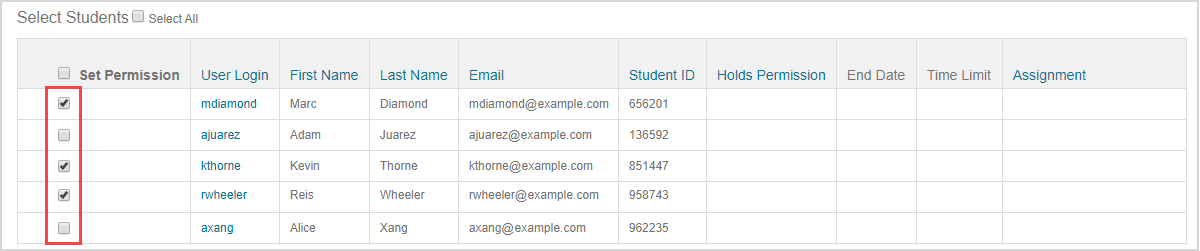 Select the check box(es) of the student(s) from the Permissions Table that you want to authorize for the selected assignment and with the selected permissions.