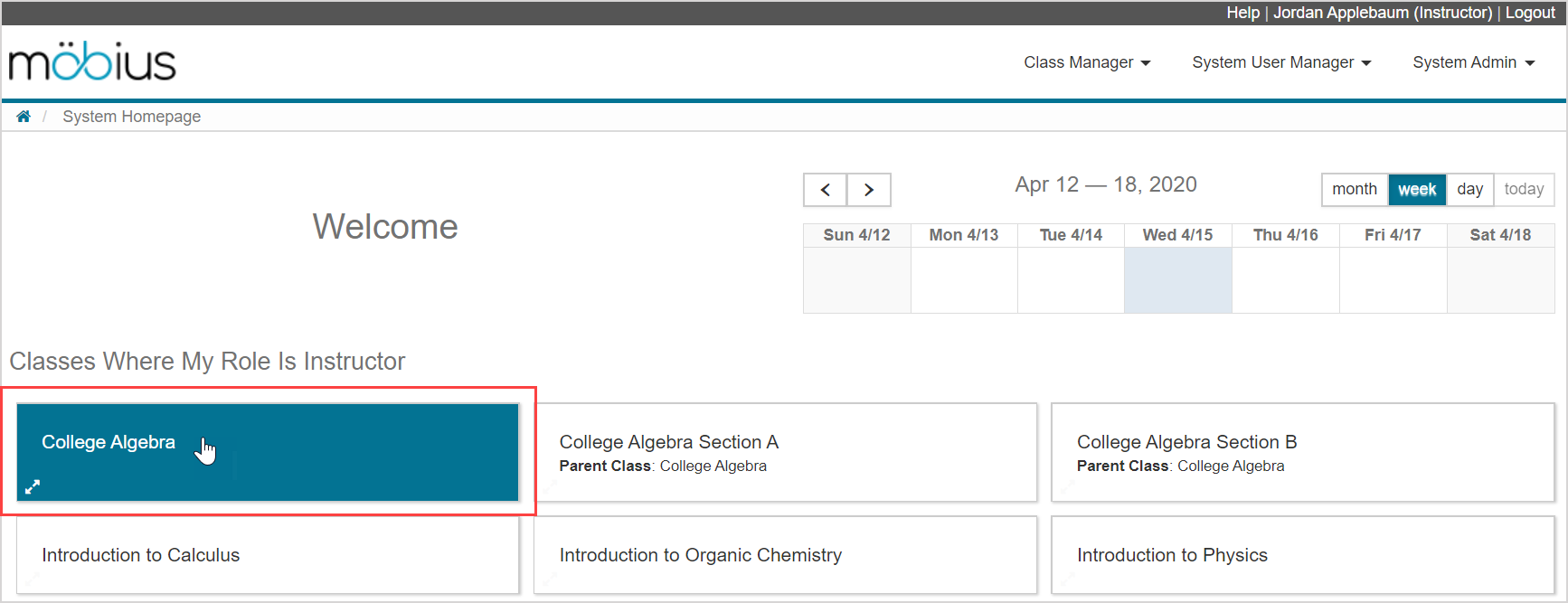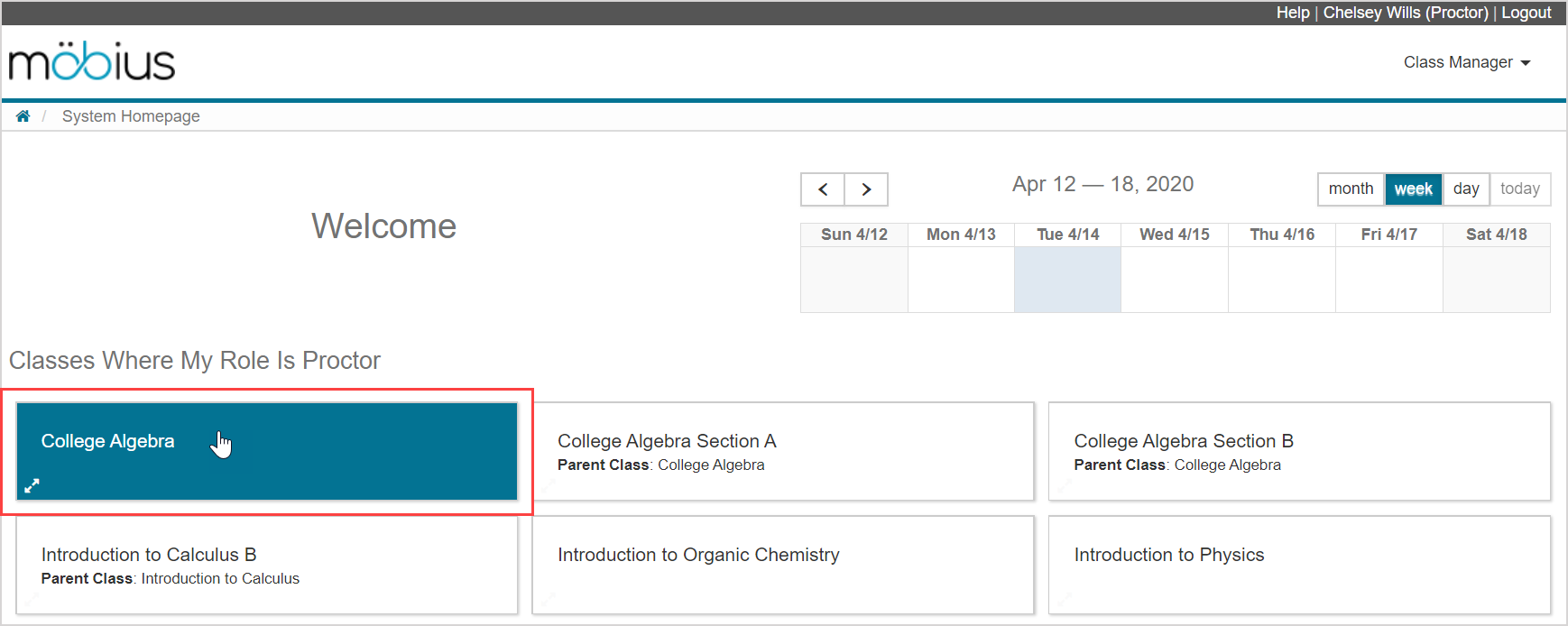 NOTE: If you're proctoring as a system proctor or class proctor, the classes that you can proctor are listed on the System Homepage with the heading Classes Where My Role Is Proctor. Click on a class name to enter the class.