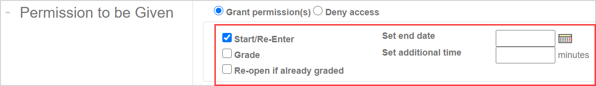 NOTE: Depending on the assignment that was searched (Example — using the advanced search to list all students for a specific assignment), some specific permissions might not be available depending on that assignment's defined properties (Example — the Set additional time field won't be visible if the assignment doesn't have a time limit already defined in its assignment properties).