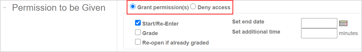 TIP: The Set end date permission will also need to be applied if the amount of additional time of the Set additional time permission extends beyond the assignment's end date. IMPORTANT: Multiple uses of this permission will override any previous additional time, and won't be cumulative. Example — If a proctor has previously authorized 15 minutes of additional time, then to add another 15 minutes you will need to enter 30 minutes in the Set additional time field. Example — Enter 0 minutes to revoke additional time that has previously been applied. |