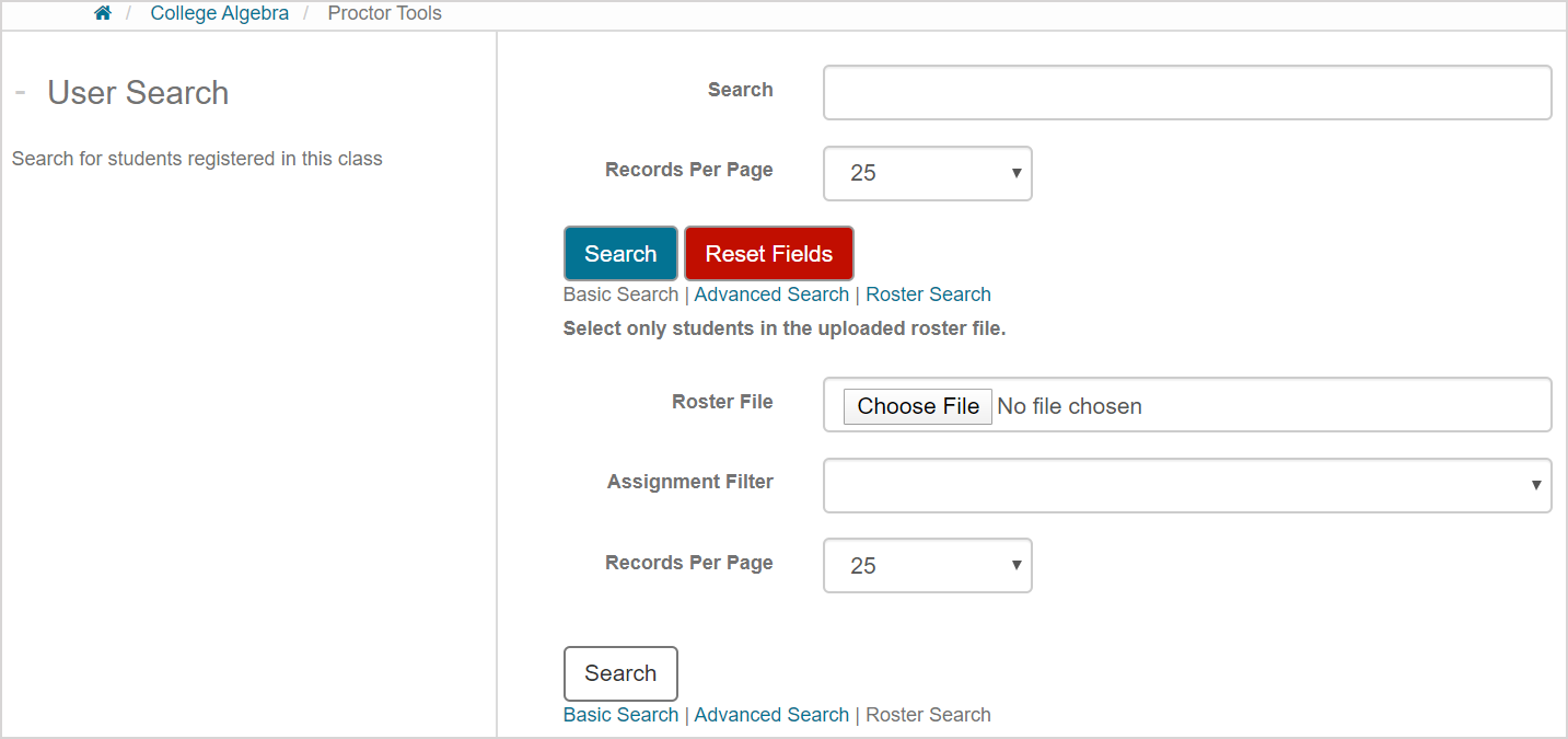 TIP: The user roster file that you upload contains a subset of students from your class. Uploading a user roster file in Proctor Tools is, therefore, ideal for reducing the amount of searching you'll need to do for the students that you want to authorize permissions for.