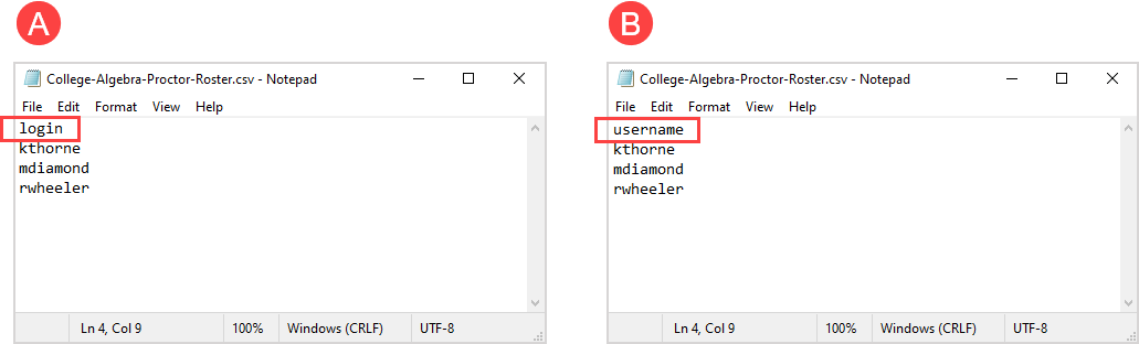NOTE: Your user roster file only requires the (A) login or (B) username attribute. The users listed in your user roster file must already be enrolled in the class.