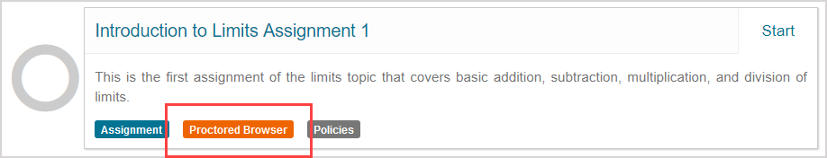 IMPORTANT: When an assignment is created that uses Proctored Browser Mode, the assignment mustn't require the student to navigate away from their active assignment window (Example — a student shouldn't have to upload a file from their computer to complete the assignment or view information on a different website).