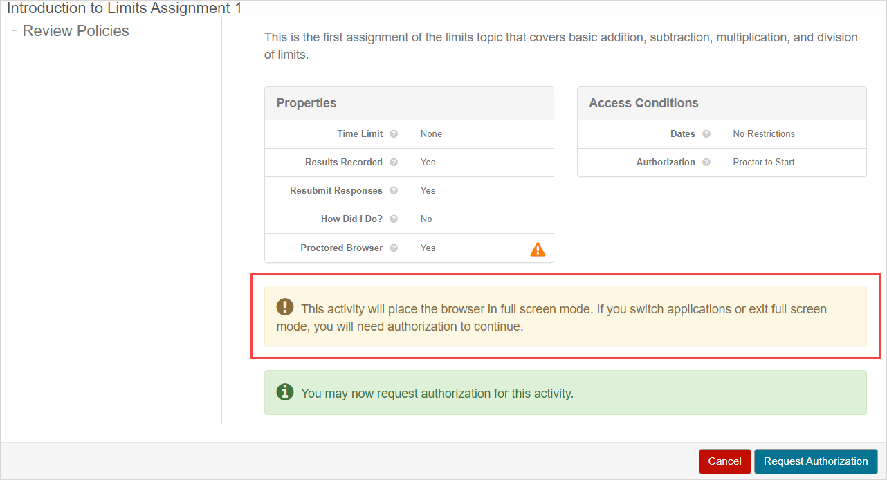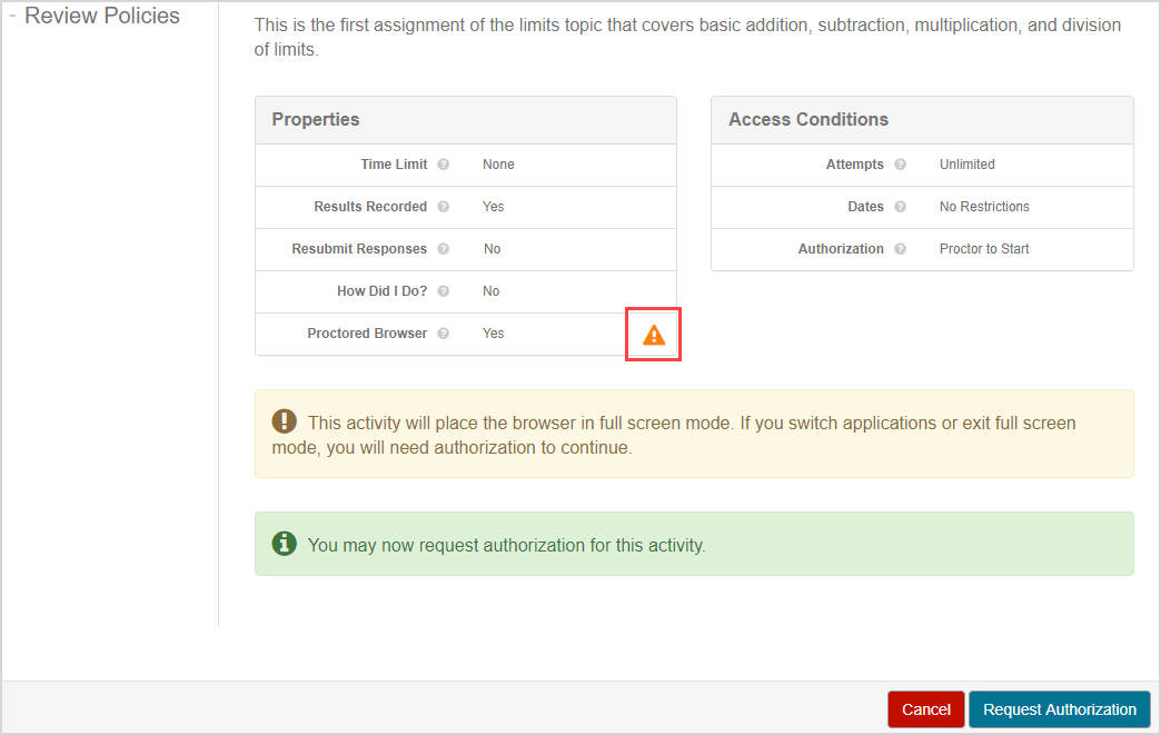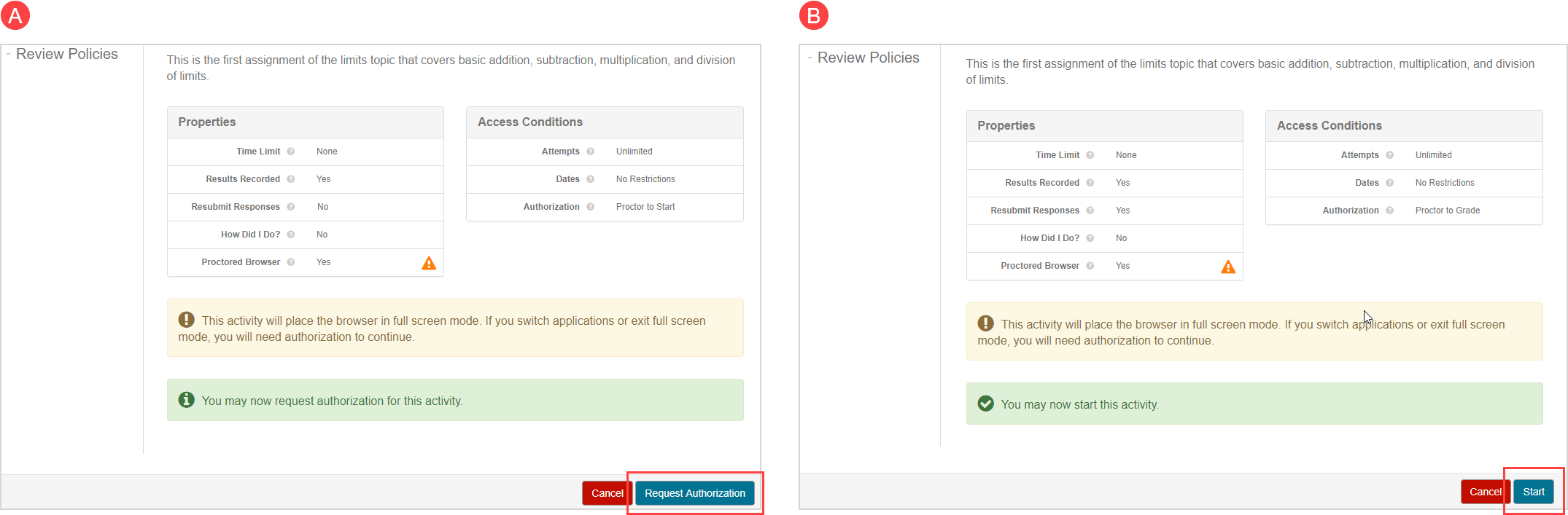 - The proctored browser is initiated when the student clicks (A) Request Authorization or (B) Start from the launch page to begin their attempt (depending on the configuration of the proctored exam).