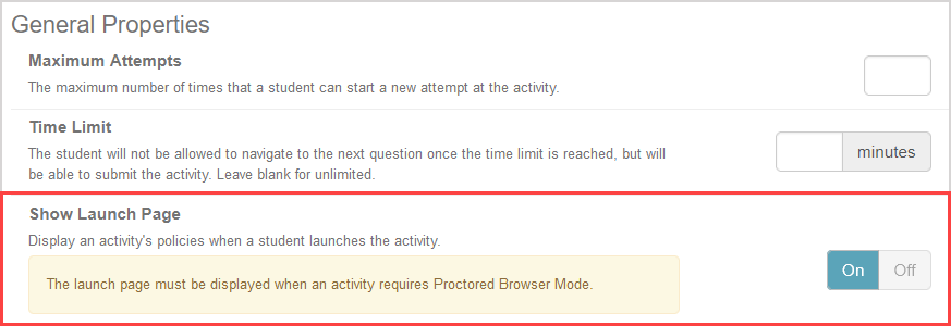- The Show Launch Page assignment property is automatically enabled when Proctored Browser Mode is enabled.
