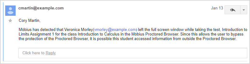 - You (as the instructor) will receive an email notification that the student has exited the full-screen Proctored Browser Mode.