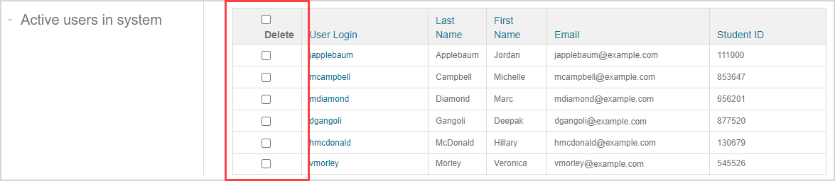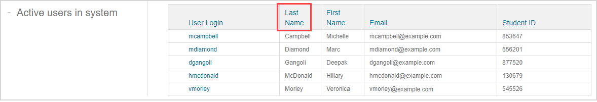 | Search | Enter a value relating to a user detail of the user profile you're searching for. Example — Enter Juarez if you know the full last name of the user you're searching for. TIP: The value you enter can be just a part of the user detail. Example — Enter 136 if you know that the student ID of the user you're searching for contains these numbers. |