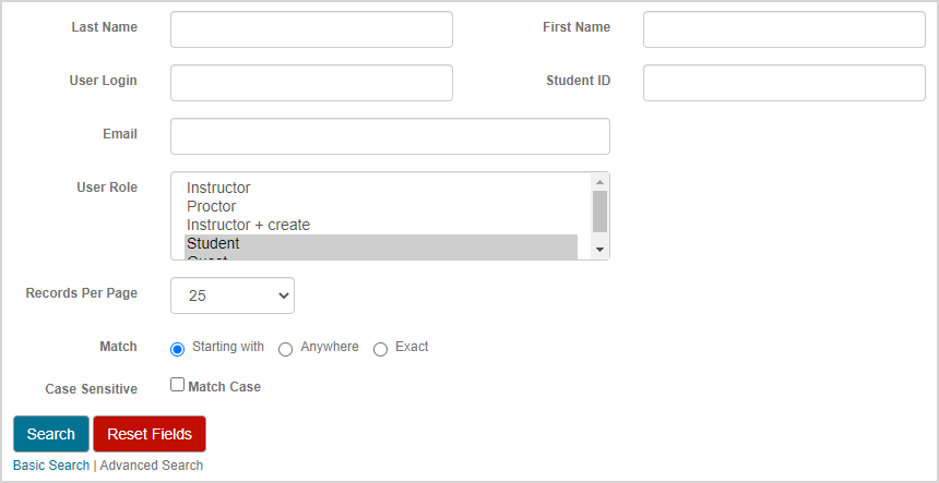 | Student ID | Enter a value relating to the student ID of the user you're searching for. |