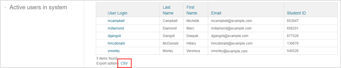 - Click CSV to export your search results to your hard drive as a record of the user search.