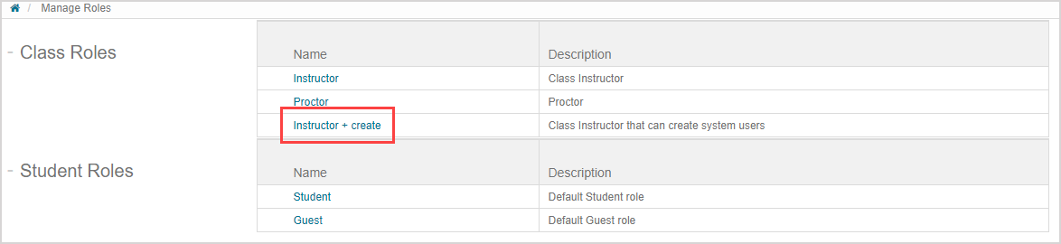 NOTE: Although these three user role categories exist in Möbius, you'll only be able to view Class Roles and Student Roles as an instructor.