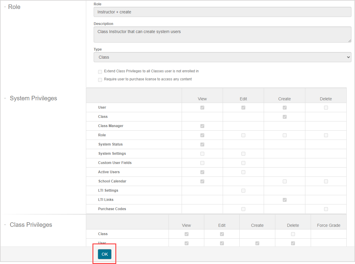 - Class Roles — User roles in this category generally have most privileges within a class but limited organization-wide access privileges (Example — instructor and instructor + create roles).
