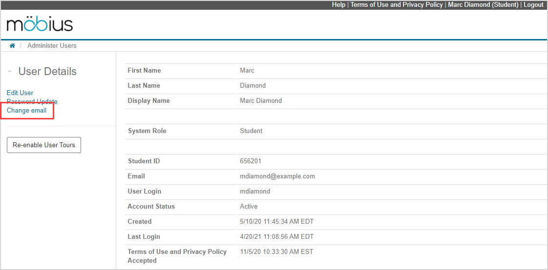 IMPORTANT: You must have a valid email address initially associated with your Möbius account in order to be able to change your account's email.