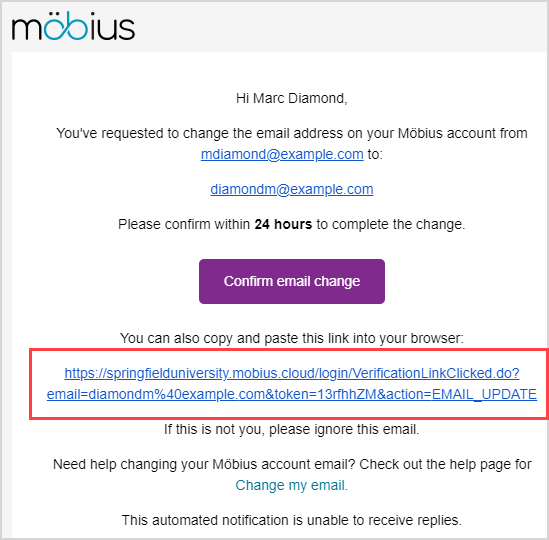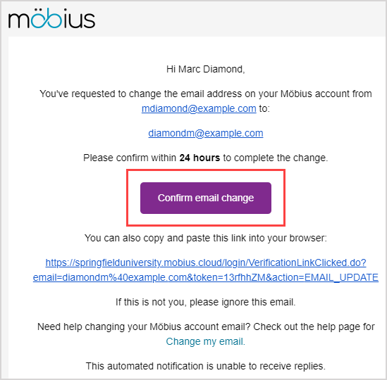 Check the inbox of your updated email for a message with the subject of Email change request for Möbius account. This verification email message contains a confirmation link for you to use to complete the process of changing your email. Click Confirm email change in the received verification email message to continue with changing your email address.