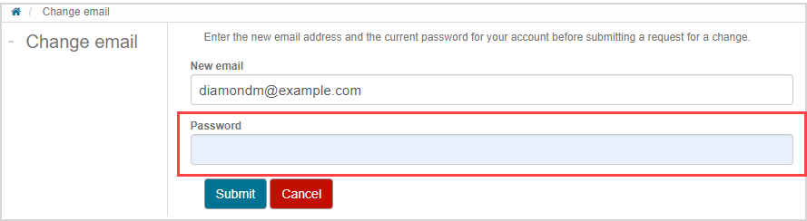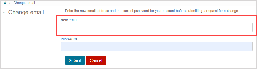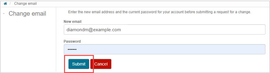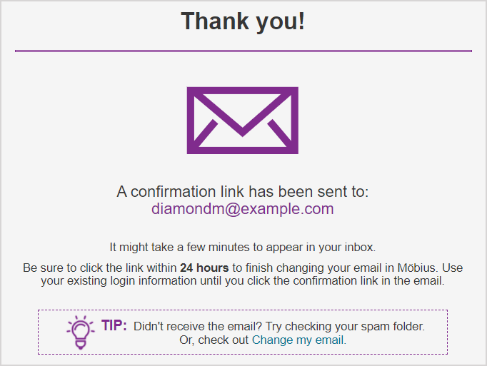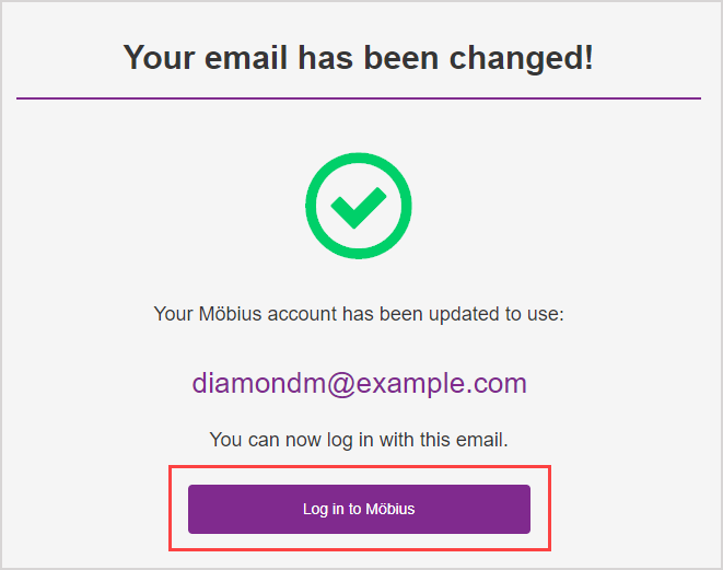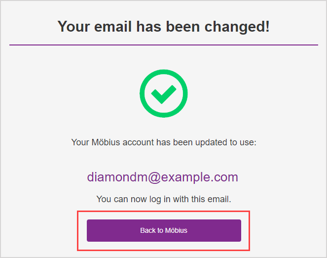 NOTE: The email that's displayed in the Your email has been changed! notification is the new email that you'll use to log in to Möbius. When logging in: