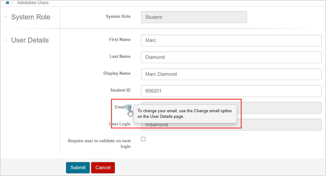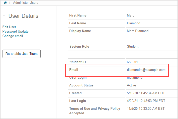 NOTE: The Edit User page has a reminder that if you want to change the email that's associated with your account, you'll have to change it through the Change email option on the main User Details page.