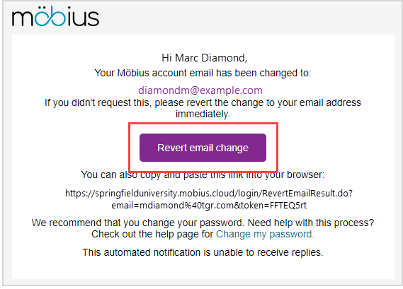 TIP: Once you've confirmed the email change, a message is sent to your old email that the email for your Möbius account has been changed. If you didn't request or intend to make this change, you can choose to undo this by clicking Revert email change in the message received by your old email. Check out Revert my email change.