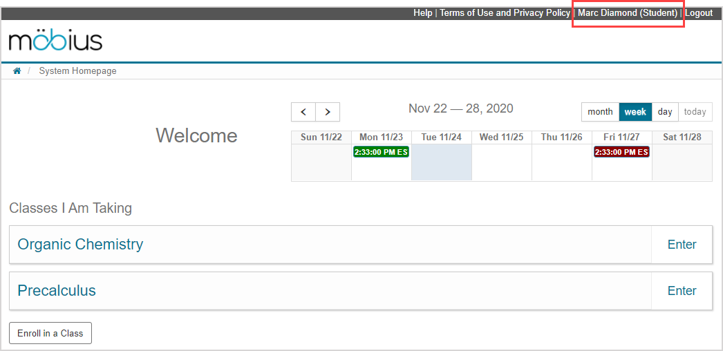 NOTE: You can't view or edit your profile if Möbius is being accessed through a Learning Management System (LMS) (Example — Blackboard®, Brightspace®, Canvas™, Moodle™, etc.).