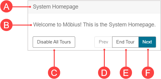 1. When you view a Möbius page that includes a User Tour, your tour messages appear. Navigate through the User Tour pop-ups: