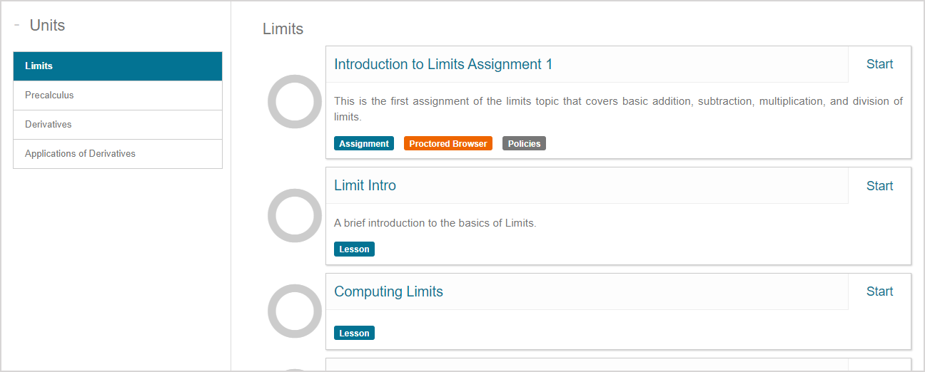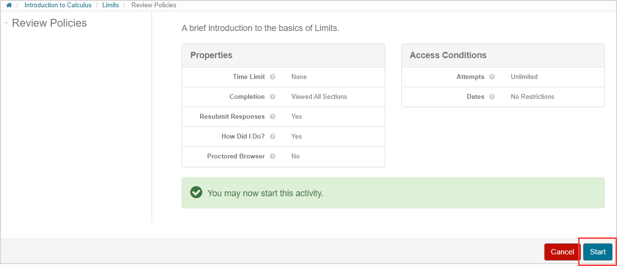 NOTE: Your instructor might design an activity to present a launch page upon starting or resuming an activity. The launch page summarizes important details about the activity's properties. Click Start to continue to the activity. Check out Review the launch page to learn about what information is displayed by the launch page.