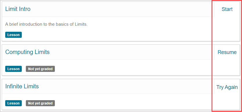 NOTE: An available activity is indicated by Start, Resume, or Try Again.