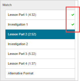 NOTE: Page completion is dependent on the lesson completion properties defined by your instructor. Example — Your instructor could define the lesson as complete only if you've viewed and completed all areas of the lesson. This translates to each individual page of a lesson. Therefore, if you've only viewed the pages and not completed all of the response areas, then the page isn't complete. If the page isn't complete, no green check mark will be visible on the lesson page Navigation pane and the lesson won't be marked as complete on the Class Homepage.