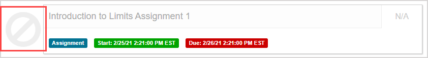 NOTE: Depending on which access condition is causing the restriction, the (A) error icon can be located in the Maximum Attempts cell, Dates cell, Advanced Policies cell, or multiple cells.