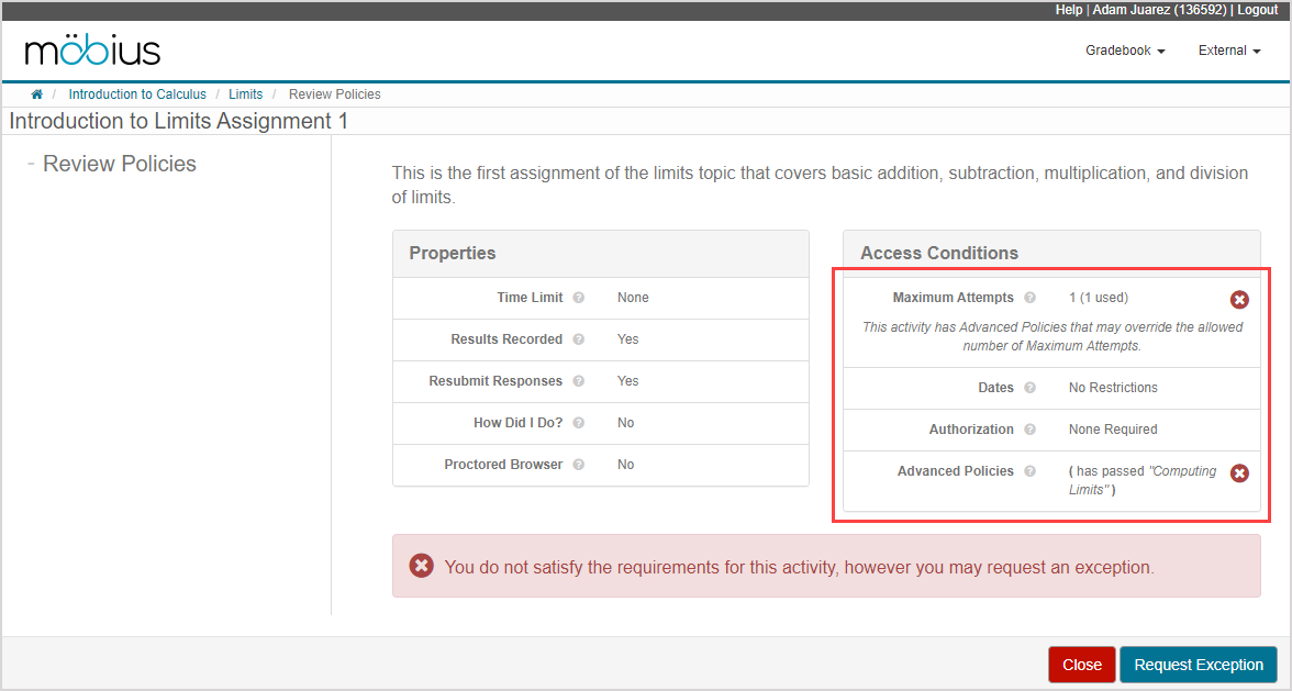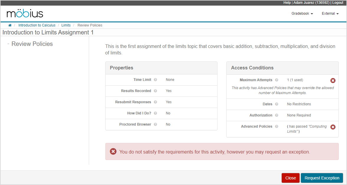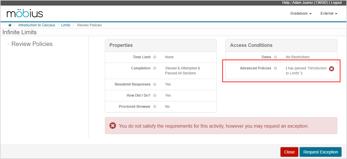 TIP: In some cases, you're able to bypass activity restriction by satisfying the Advanced Policies without requesting exception. Example — Lesson B has an Advanced Policy that requires you to have viewed Lesson A before being able to begin Lesson B. You're then restricted from beginning your attempt at Lesson B until you satisfy the Advanced Policies of Lesson B. Instead of requesting exception for Lesson B, simply complete Lesson A (assuming Lesson A doesn't have its own set of restrictions).