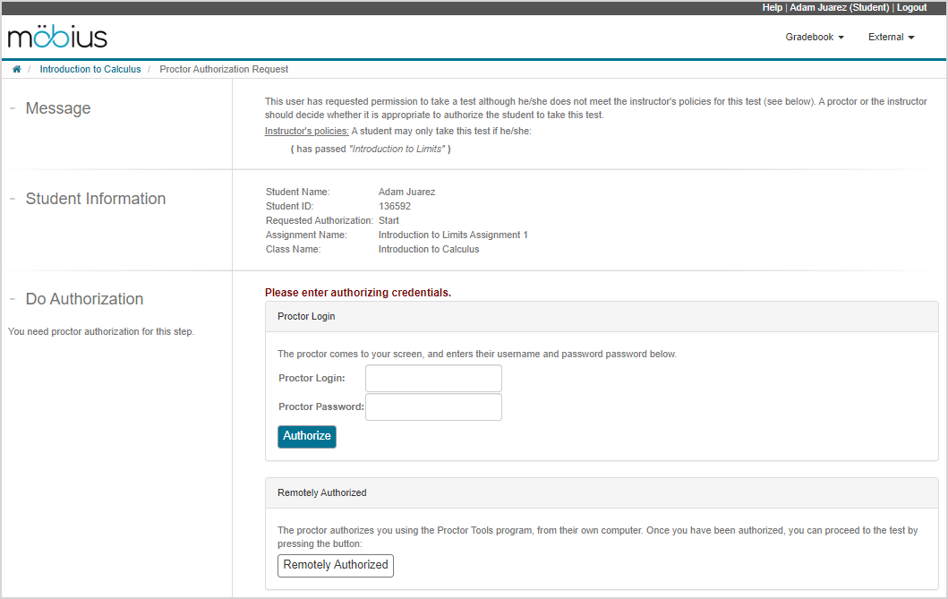 You're navigated to the Proctor Authorization Request page. You can then independently directly contact your instructor or proctor to notify them that you're requesting an exception to begin an attempt at a restricted activity. Your instructor or proctor can authorize you locally on your computer or remotely from their own computer.