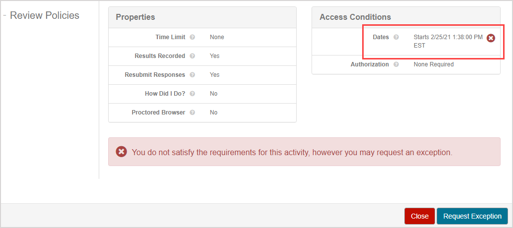 NOTE: If your activity has the Dates property defined and you're attempting to access it outside of this date range directly through Möbius, you won't be able to start the activity because it will be displayed as unavailable on the Class Homepage (you won't be able to request an exception through Möbius because you aren't able to access the launch page to click Request Exception).