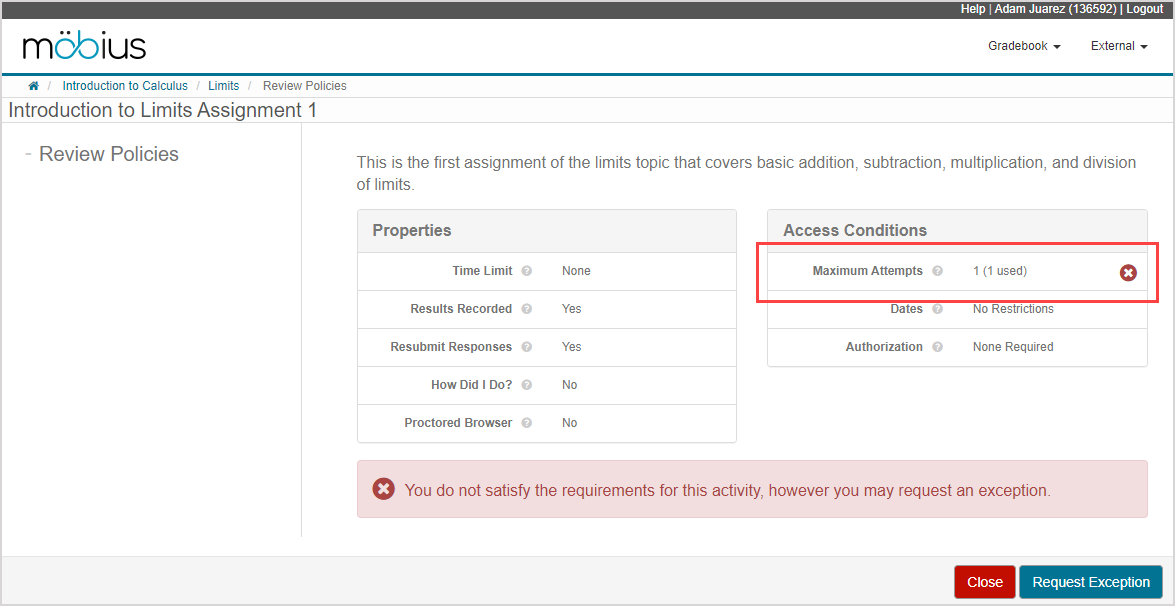 If you've already used up all of your allowed attempts at an activity, then you won't be permitted to begin another attempt. Example — Assignment A has a Maximum Attempts property of 2 attempts. If you click to begin a third attempt at Assignment A, your attempt will be restricted and you'll need to request exception for an additional attempt.