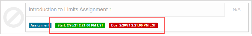 The start and/or end dates of the activity's availability are displayed on the activity's pane on the Class Homepage.