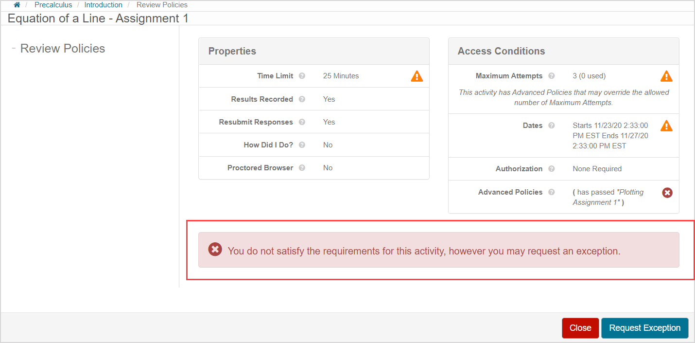 You can then click Request Exception which is in place of the Start button within the (D) Attempt Controls to request an exception for your ineligibility at the activity (and Close replaces Cancel).
