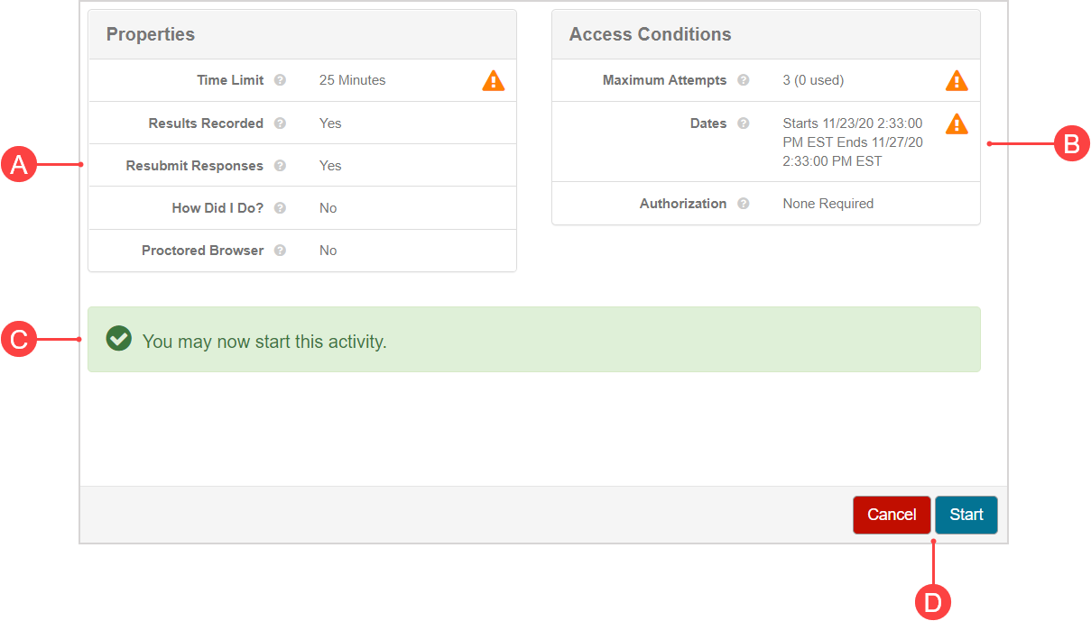 B. Access conditions — Displays specific activity properties that can impact your eligibility to begin your attempt: