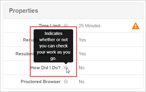 - How Did I Do? — Indicates if you can check your responses during your attempt (defined using the How Did I Do? property).
