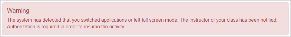 - You'll receive an on-screen message that the instructor has been notified of your exit from the full-screen mode and that re-authorization is required.
