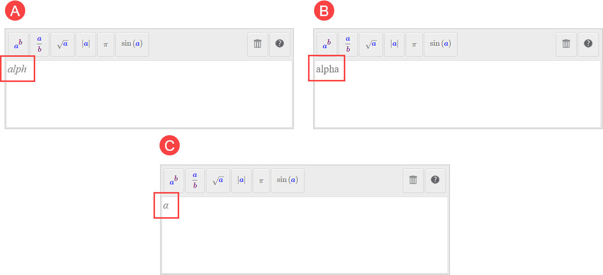 - You can type out the full name of the symbol you want to use. If the symbol name transitions from (A) italics to (B) plain font, you can press Ctrl + Spacebar and the (C) actual symbol will automatically replace the entered text (Example — entering alpha and using the symbol completion shortcut will automatically insert a):
