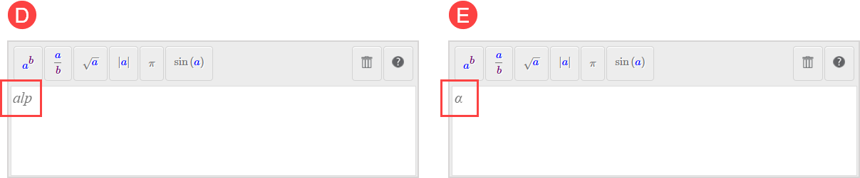 - Some symbols only require the (D) first few letters of the name of the symbol to be entered for the (E) symbol completion (Ctrl + Spacebar) to be used (Example — entering alp and using the symbol completion shortcut will automatically insert a):