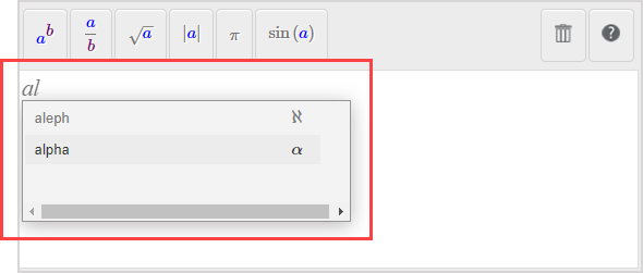 - If more than one completion option is available for the text that's entered, use your mouse or up and down arrow keys to select the desired symbol from the symbol completion drop-down list (Example — entering al and using the symbol completion shortcut will reveal all potential symbols relating to the text entry of al):
