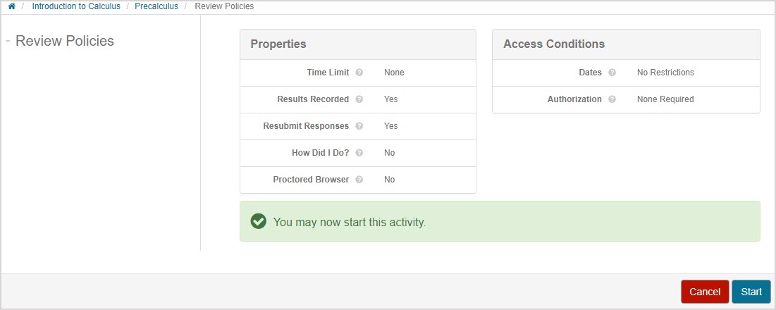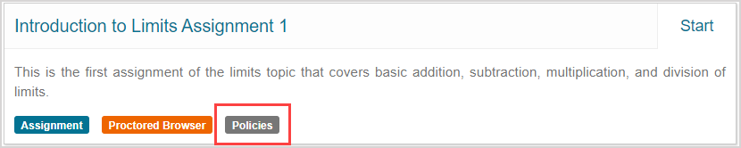 If your activity has a unique set of properties, you can click the Policies tag on the activity pane (on the Class Homepage) to see a preview of the important settings that will affect your attempt.