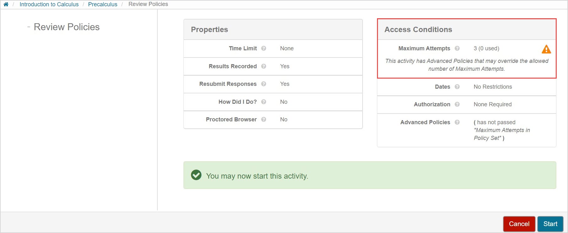 IMPORTANT: If an activity has Advanced Policies applied and a defined Maximum Attempts property, interpret your available attempts carefully. This warning is also visible on a launch page that will automatically be displayed if an activity has Advanced Policies applied. Example — You may have a maximum of 2 allowed attempts at a new activity, but an Advanced Policy may state that you first need to complete a preceding activity. This technically means you have 0 available attempts at this new activity until you complete the preceding activity.