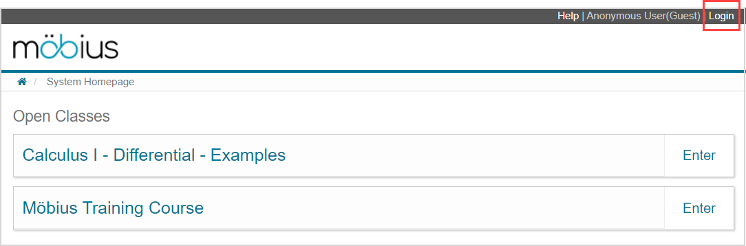 TIP: If you're using anonymous access, you can click Login at anytime to log in to Möbius with your direct log in credentials or your single sign-on credentials. Check out Use anonymous access to learn about interacting with Möbius content without logging in.