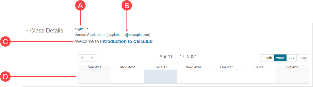 NOTE: Your instructor may not have defined any information to be displayed in the sections (A) link or (C) class message sections of the Class Details.